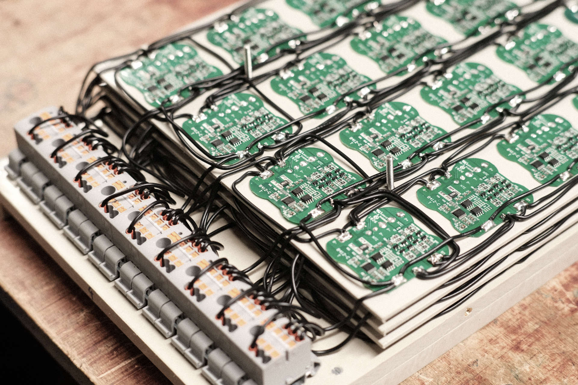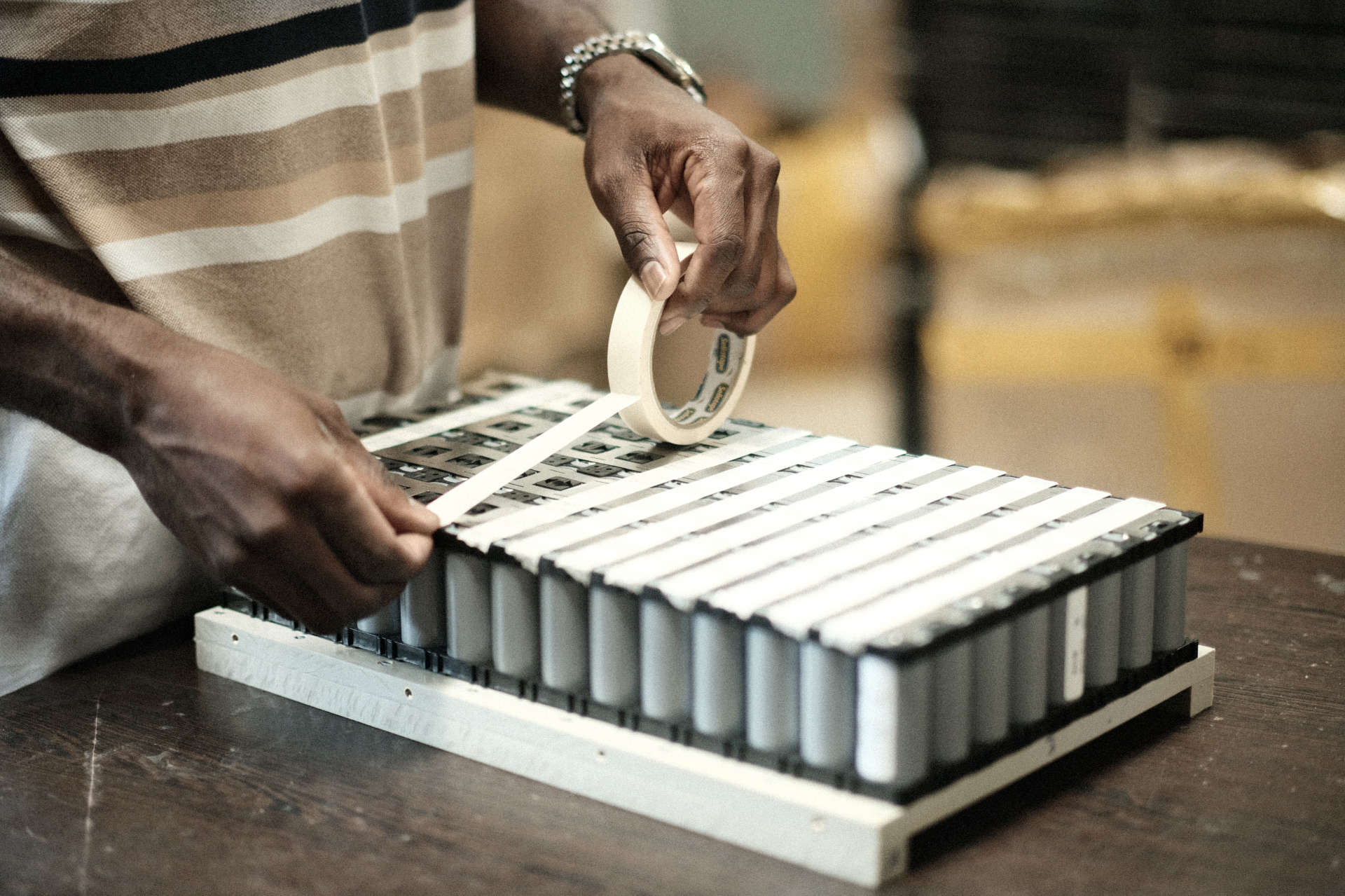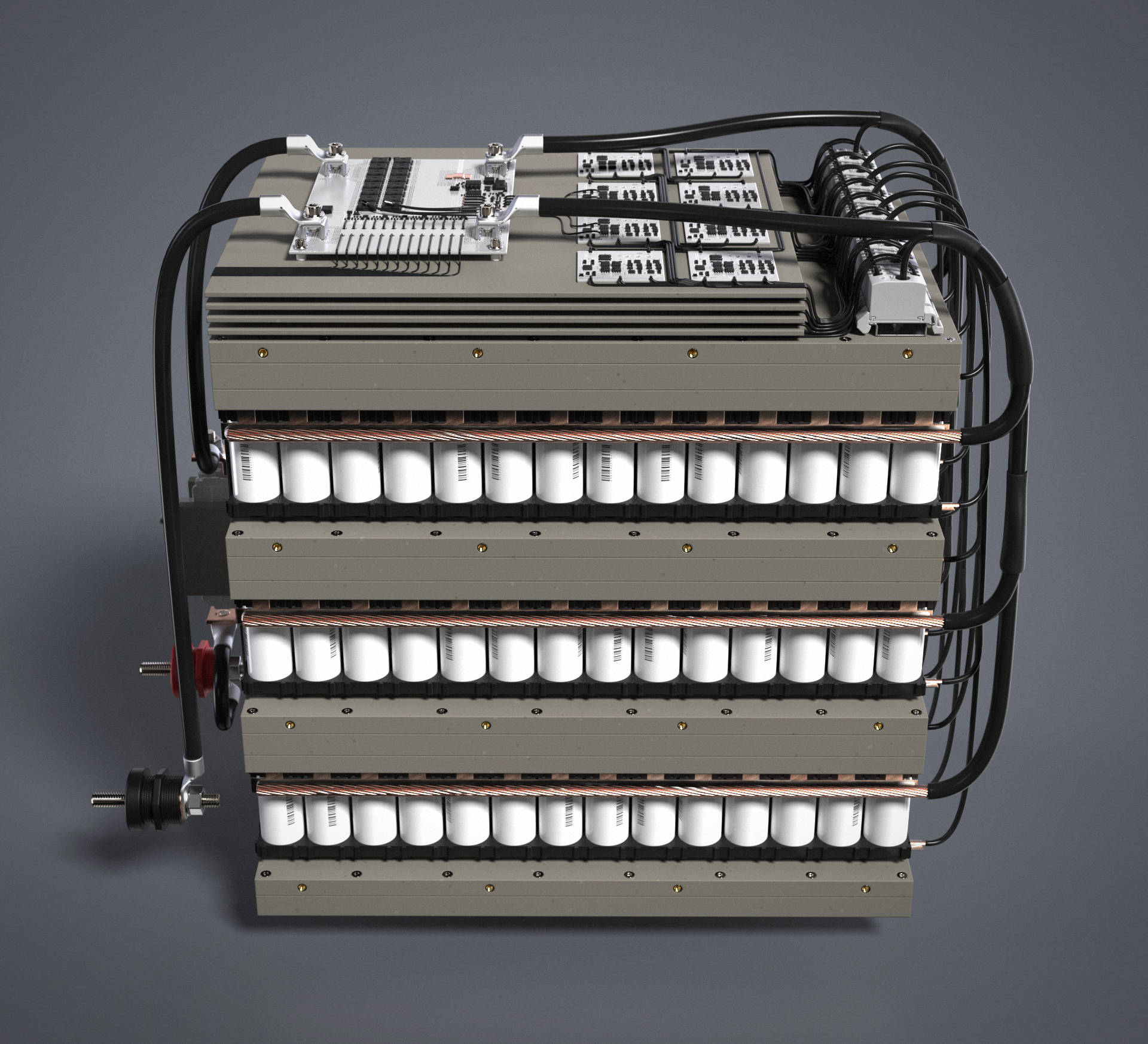 Fully disassemblable modules made out of standard components. Electrical contact through compression. No cell spot-welding.