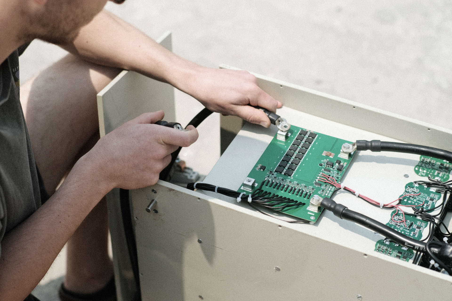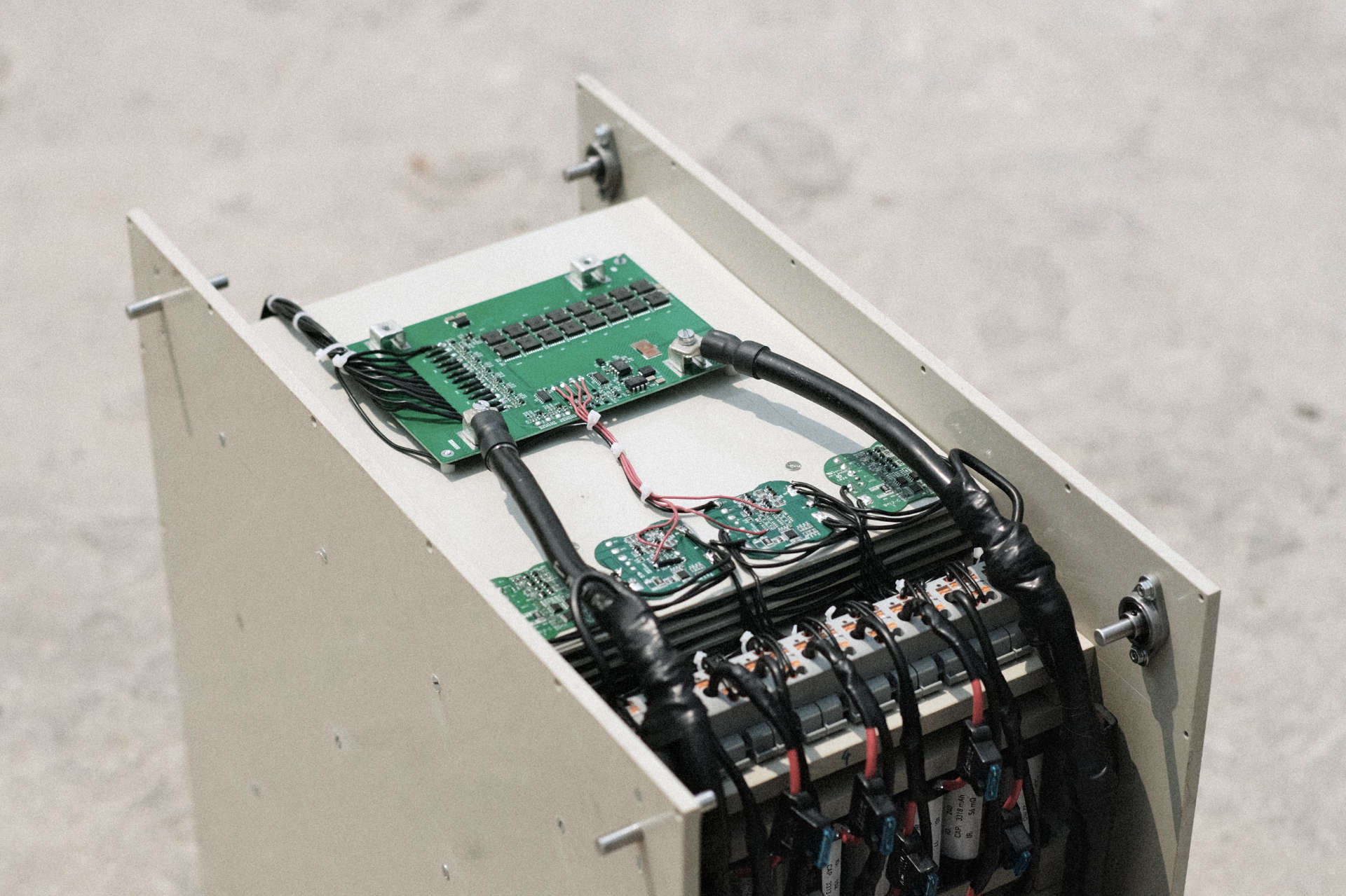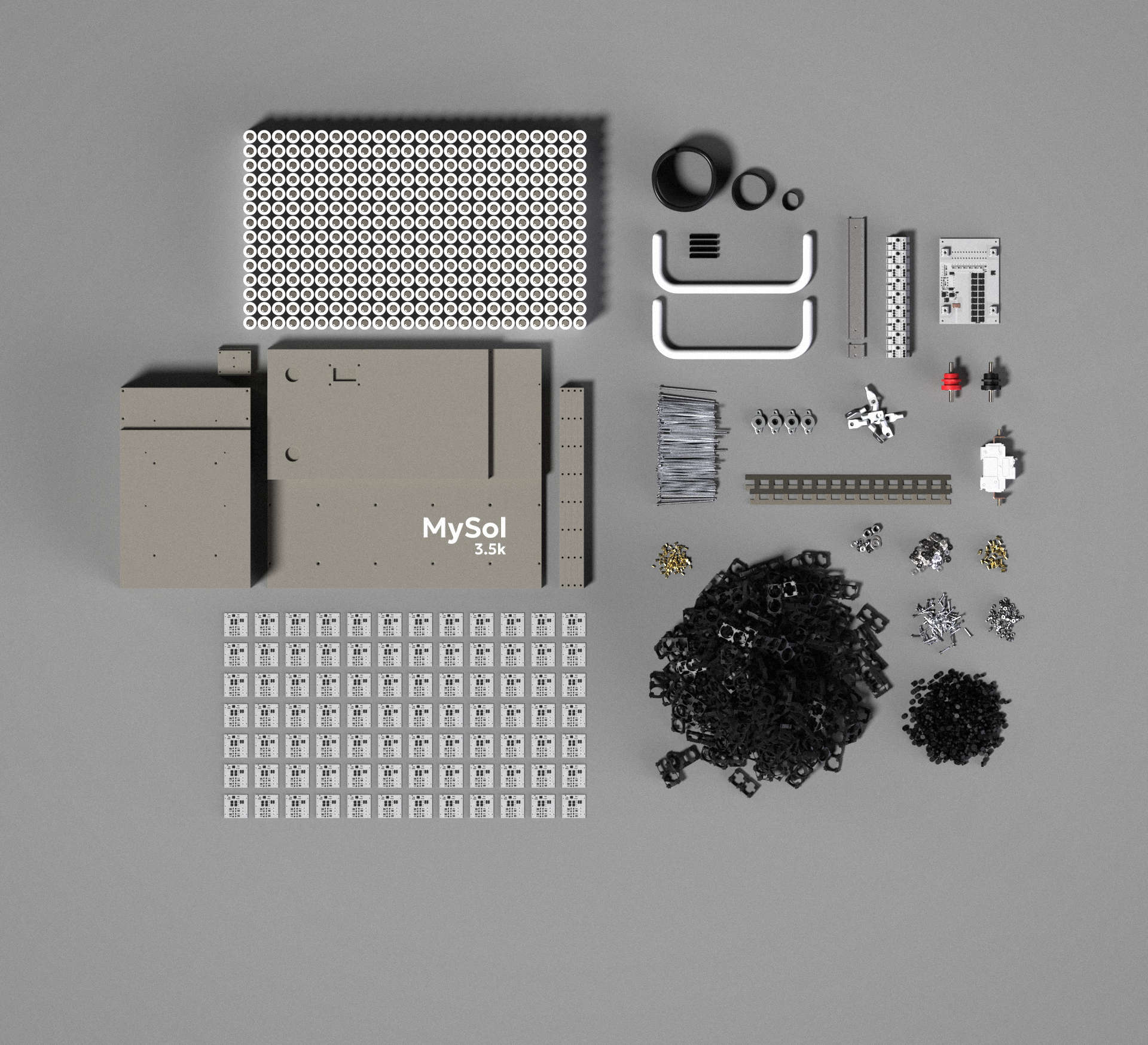 Fully disassemblable modules made out of standard components. Electrical contact through compression. No cell spot-welding.